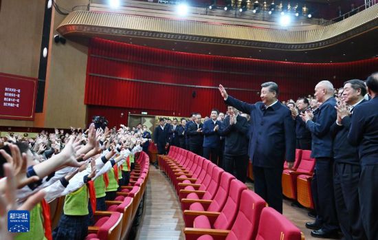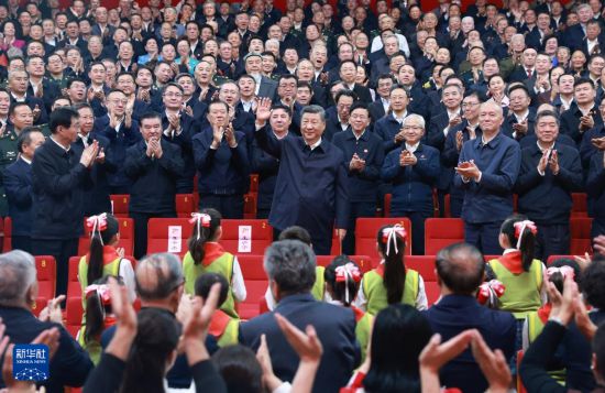 9月24日晚,慶祝新疆維吾爾自治區成立70周年文藝晚會《美麗新疆》在烏魯木齊文化中心大劇院舉行。中共中央總書記、國家主席、中央軍委主席習近平觀看演出。這是習近平向觀看演出的新疆各族干部群眾揮手致意。新華社記者 謝環馳 攝