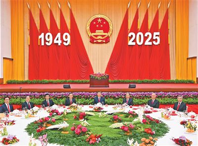 人民大會堂宴會廳華燈璀璨,洋溢著喜慶熱烈的節日氛圍。主席台上方高懸著庄嚴的國徽,“1949—2025”大字年號在鮮艷紅旗映襯下格外醒目。