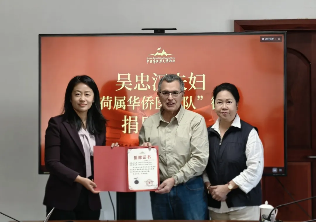 11月4日上午,抗戰時期“荷屬華僑醫療隊”隊長吳雲燦之子吳忠漢與夫人劉美英一行,從荷蘭專程來華,到訪中國華僑歷史博物館,捐贈吳雲燦生前佩戴的荷屬華僑醫療隊徽章,將這份承載著華僑愛國情懷的歷史信物交付博物館珍藏。中國華僑歷史博物館副館長雷霆接受捐贈,並為吳忠漢夫婦頒發捐贈証書。