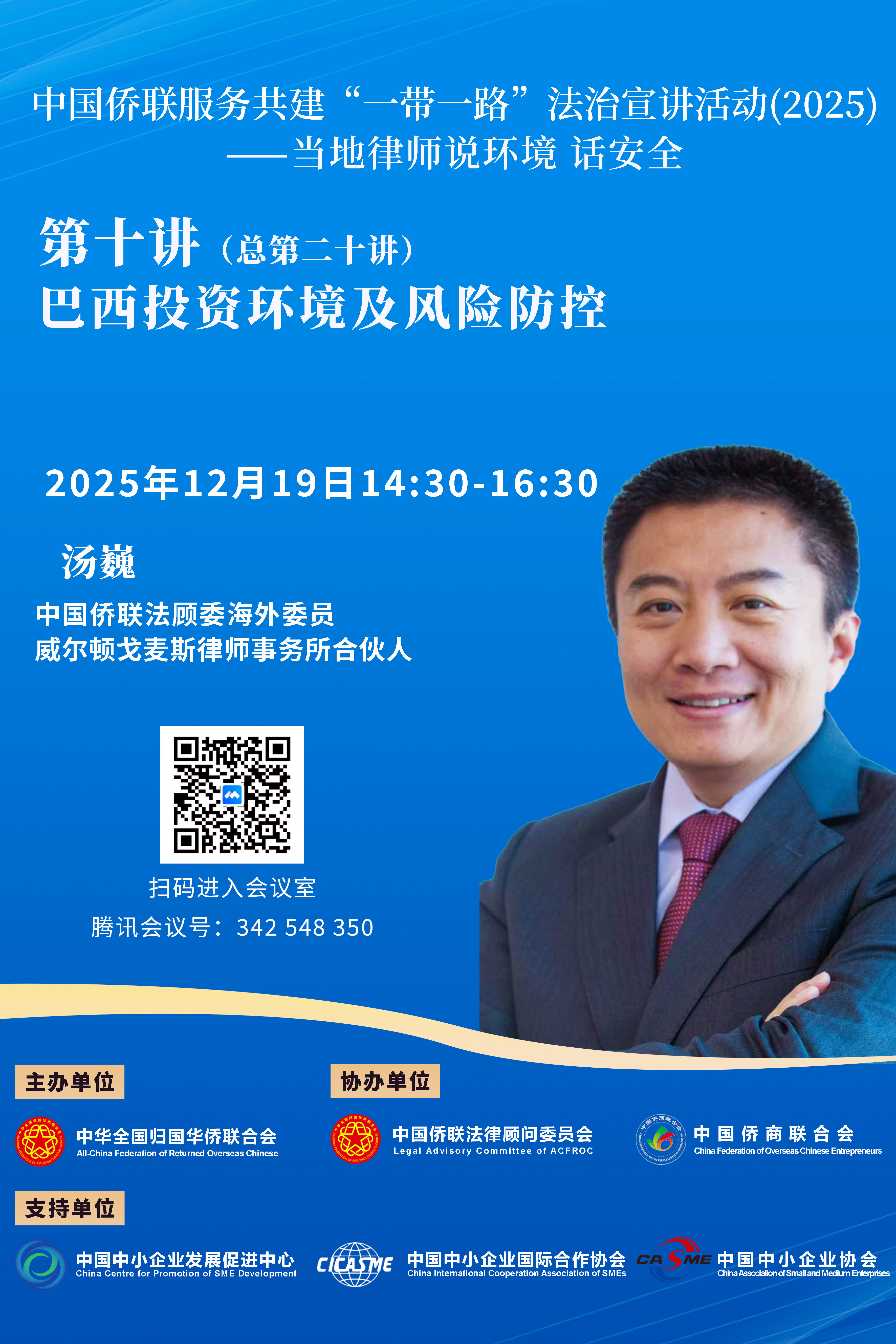 今年第十講(總第二十講)將於2025年12月19日(周五)14:30開播,由中國僑聯法顧委海外委員巴西湯巍律師主講。湯巍律師畢業於巴西聖保羅大學法學院,在巴西從事律師工作二十余年,精通巴西民法、公司法、行政法,尤其在外商投資、國際貿易及基礎設施建設等領域擁有深厚造詣。湯律師同時在巴西華人協會、巴西廣東同鄉總會等多家僑團擔任重要職務,致力於為巴西當地華人華僑、中資企業及中國駐巴西使領館提供專業法律服務。
