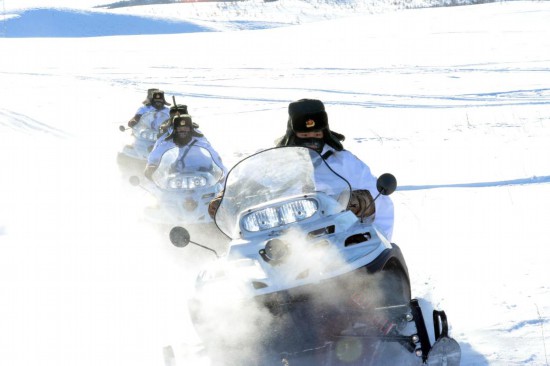 北部戰區陸軍某旅三角山邊防連官兵駕駛摩托雪橇執勤。新華社發(2014年1月攝)