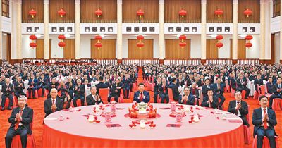 人民大會堂宴會廳燈光璀璨、喜氣洋洋,各界人士2000多人歡聚一堂、共迎佳節,現場洋溢著歡樂祥和的節日氣氛。