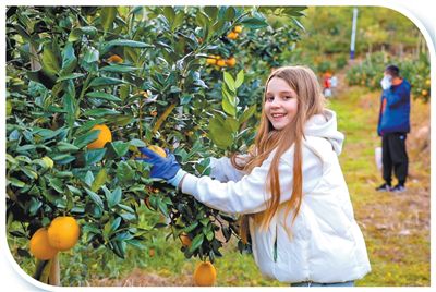 便利政策疊加特色體驗,讓“沉浸式”體驗消費逐漸成為“中國購”新熱點。圖為在江西省贛州市的一家臍橙種植基地,外國游客體驗採摘贛南臍橙。朱海鵬攝(人民視覺)