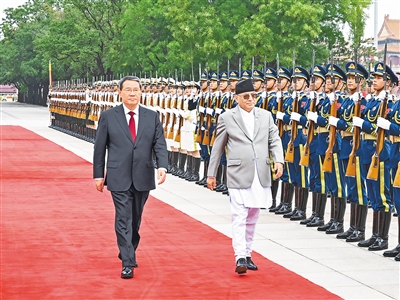 9月25日上午,国务院总理李强在北京人民大会堂同来华进行正式访问的尼泊尔总理普拉昌达举行会谈。这是会谈前,李强在人民大会堂东门外广场为普拉昌达举行欢迎仪式。新华社记者 饶爱民摄