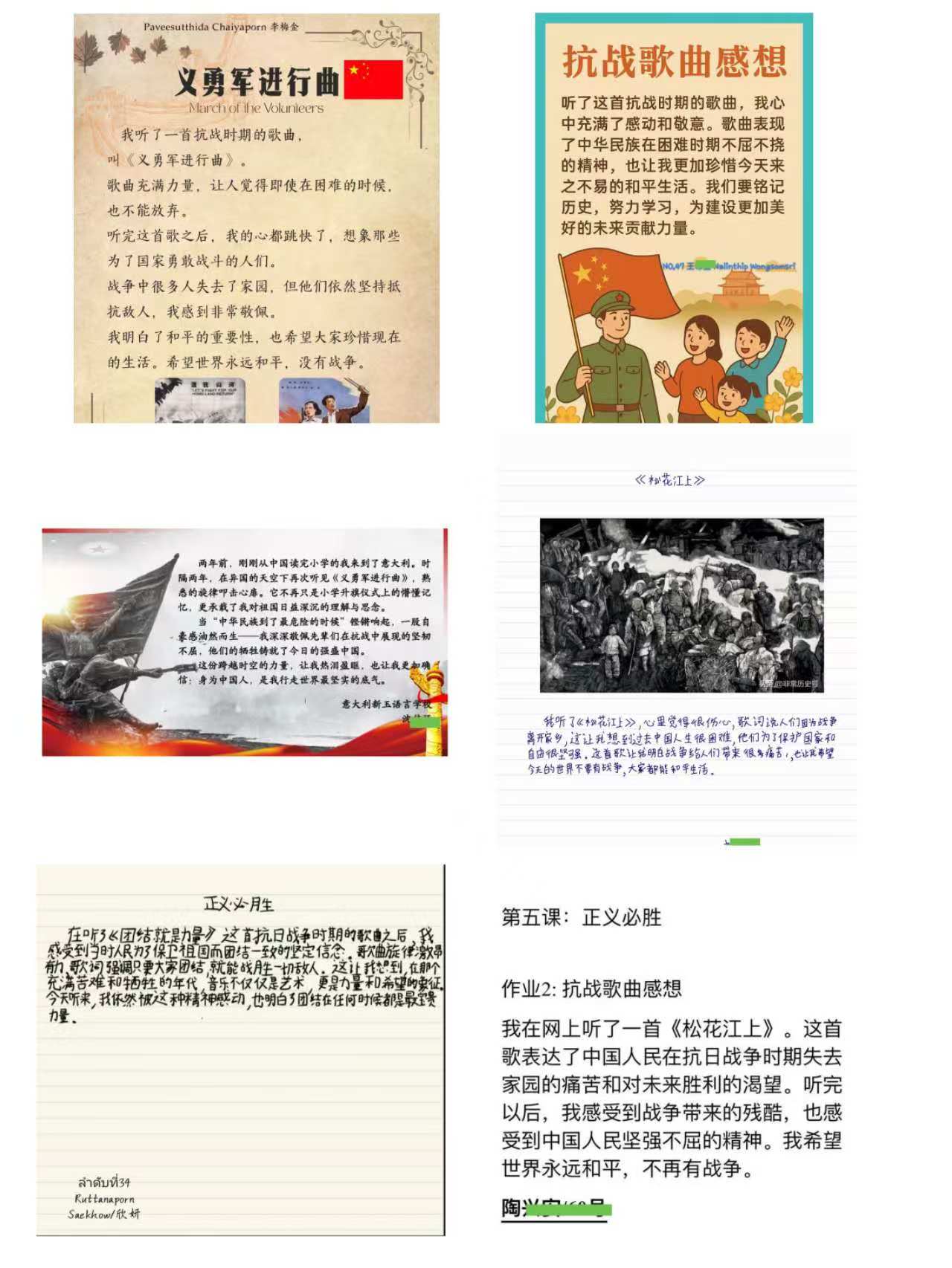 课后,营员们还自发重温或学唱《义勇军进行曲》《保卫黄河》《团结就是力量》《松花江上》等抗战歌曲,并创作提交了丰富多彩的作品,用文字、语言、视频等描绘和平、唱响未来。