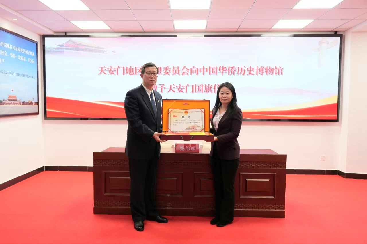 2025年11月28日下午,北京市人民政府天安门地区管理委员会在天安门国旗教育馆举行庄严仪式,向中国华侨历史博物馆赠予2014年10月21日在天安门广场升起的中华人民共和国国旗。副馆长雷霆代表侨博出席仪式并接受赠旗。