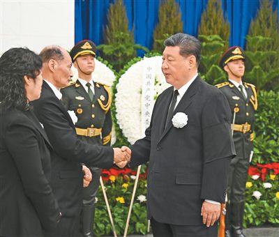 3月10日,宋平同志遗体在北京八宝山革命公墓火化。习近平、李强、赵乐际、王沪宁、蔡奇、丁薛祥、李希、韩正等前往八宝山送别,胡锦涛送花圈表示哀悼。这是习近平与宋平亲属握手,表示深切慰问。新华社记者 谢环驰摄