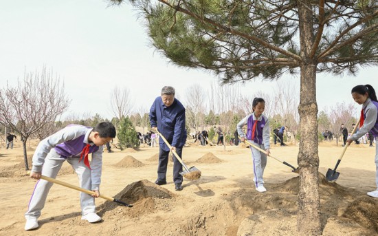 3月30日,党和国家领导人习近平、李强、赵乐际、王沪宁、蔡奇、丁薛祥、李希等来到北京市昌平区百善镇参加首都义务植树活动。这是习近平同大家一起植树。