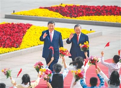 双方要同心协力,携手同行现代化道路。要加快发展战略对接,优先推进基础设施互联互通。要加强人工智能、半导体、物联网等新兴领域合作。中方欢迎更多越南优质产品进入中国市场。双方要继续加强旅游、文化、媒体、教育、卫生、体育等友好交流合作,促进两国人民相知相亲。我愿同你一道宣布启动2026—2027年“中越旅游合作年”。